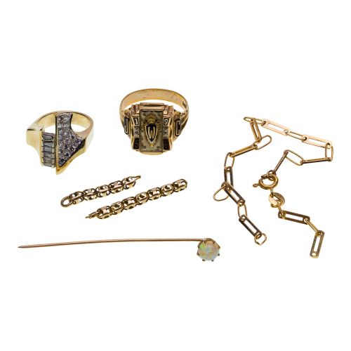 (6) items including a ring having diamonds, a bracelet and (2) sections of chain (bracelet marked "14k") as well as a 1958 school ring and a stick pin having a round cut cabochon opal (ring marked "10k")