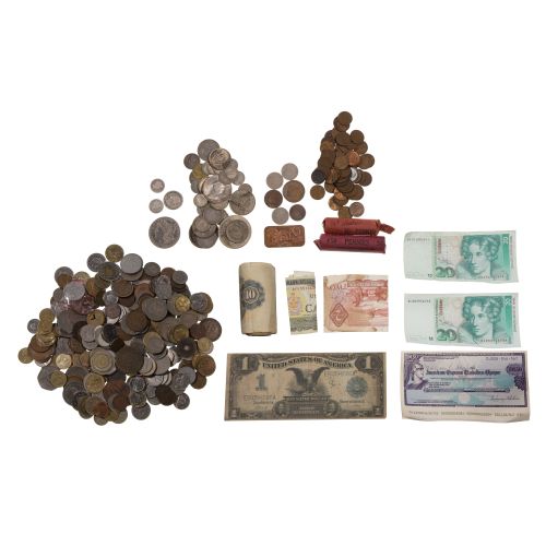 Including US 90% silver, world silver, US type coins and 1899 $1 silver certificate as well as world coins and currency
