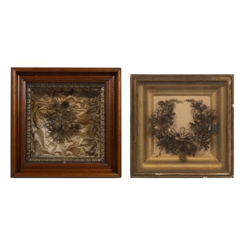 (2) items, both having a floral motif, one having applied pearls and beadwork, each framed in a shadow box style frame