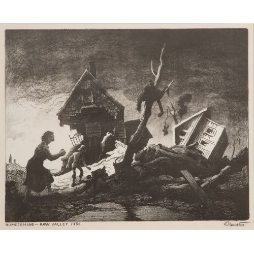 1951, pencil signed lower right, titled lower left, depicting a family returning to a home destroyed by the Kaw Valley flood, matted behind acrylic in a black painted wood frame having conservator Dennis S. Hester's, North Barrington, Illinois label verso and accompanied by a Paramour Fine Arts, Franklin, Michigan online catalog printout