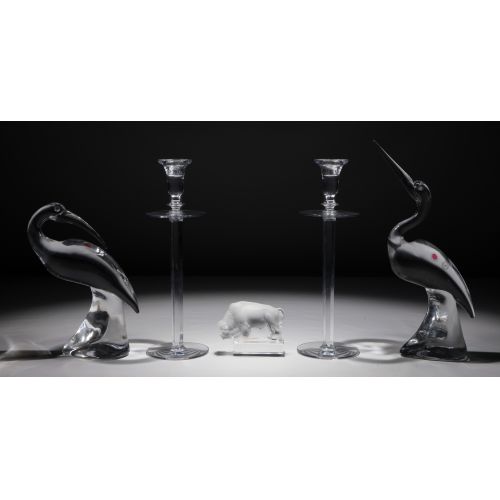 (4) items including a Lalique buffalo, (2) Vilca swans and a pair of Louise Kennedy candleholders
