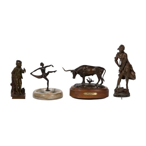 (4) items including a bronze "Spirit of Texas" by Tom Moss, signed on back edge, on rotating wood base, a bronze boy holding a bird, an Art Deco bronze female with onyx ashtray and a cast metal "The Fisher" after August Moreau having signature on back edge
