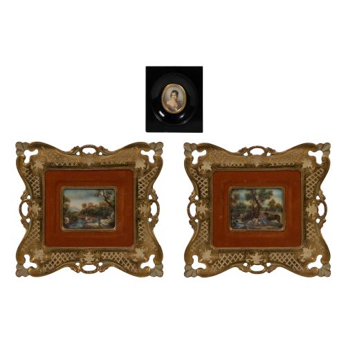 (3) including (2) landscape paintings signed illegibly lower left and lower right and a portrait painting signed lower right, all under glass in wood frames