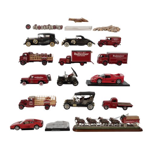 (15) total items, (8) delivery vehicles from the Budweiser collection including a resin Clydesdale wagon, delivery and panel trucks, most with cargo, all marked; together with battery operated vehicles and sports car models