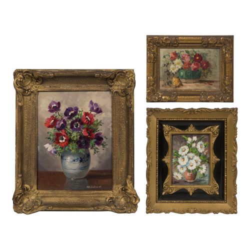(3) total items including an undated, signed "Eckhardt" depicting a floral arrangement, in a gold-tone wood frame; together with (2) oils on canvas including a Clarisse signed and an unsigned work both in gold-tone wood frames