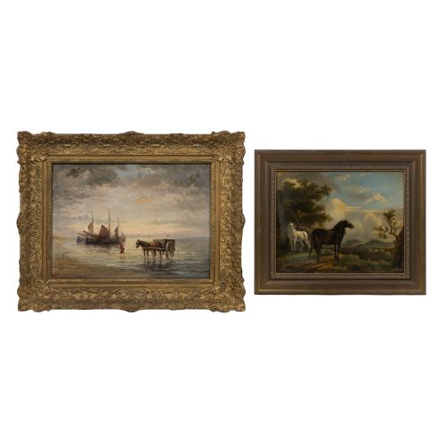 (2) total items including an undated de Graaf, signed on left edge, depicting a white and brown horse; together with an unknown artist oil on canvas painting, depicting a horse with carriage and a sailboat in the background, both having gilt wood frames
