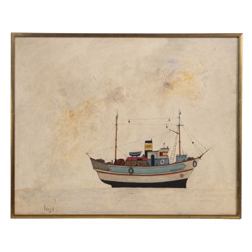Undated, signed lower left, depicting a double-masted ship against an impasto background, in a gold-tone faced black wood frame, a biographical note in envelope attached verso