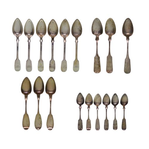 Including (6) coin silver tablespoons (some marked), (6) coin silver teaspoons (some marked) and (6) 0.830 silver tablespoons (marked)