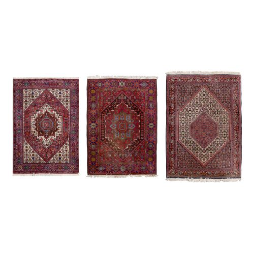 (3) hand woven items including a floral having a center medallion in hues of blue, green, cream and brown on a blue field, a geometric motif having a center medallion in hues of green, blue and orange on a red field (4 ft. 7 in. x 3 ft.5 in.) and a geometric motif having a center medallion in hues of wine, pink and blue on a cream field (4 ft. 5 in. x 3 ft. 5 in.)