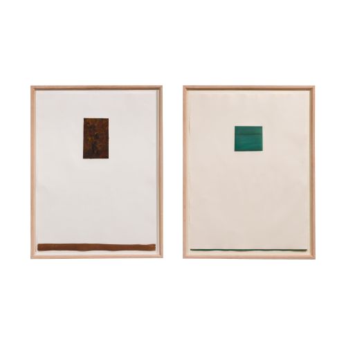 (2) items, undated and unsigned, each depicting an abstract rectangular composite having a narrow strip of color at the lower edge, one in shades of green and one in brown, Robin Lockett Gallery label verso to brown print, each mounted floating under acrylic in a wood frames