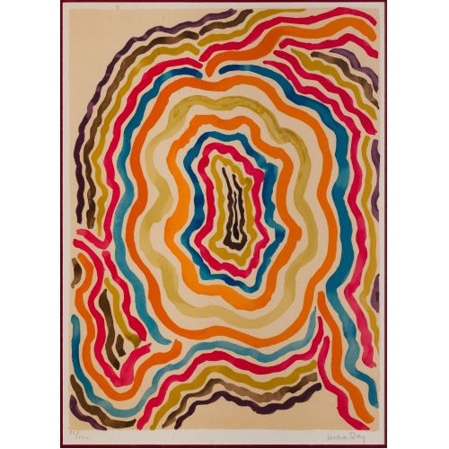 1971, pencil signed and #75/180 to the lower margin, depicting an abstract composition of irregular concentric rings in bright colors, pulled from the portfolio "De l'Origine des Especes par Voie de Selection Irrationelle", published be Leon Amiel and Galleria Schwarz, New York and Milan, matted and framed under acrylic in a gold-toned wood frame
