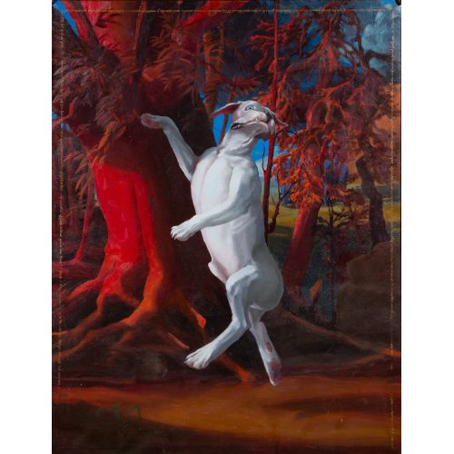 Undated, unsigned, depicting a white dog against a surrealist-style landscape in red, ochre and blue, a painted narrative inscription around the border, housed in an artist-painted frame listing toxic chemicals and the companies that produced them