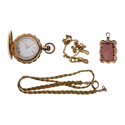 (4) total items including a pocket watch serial #6519659 dating to 1897, 11-jewel movement, grade 110, model 1, class 60 (watch marked "14k US Assay"); together with mixed gold watch chain, a fob having two different semi-precious gemstone inserts (chain and fob unmarked) and a gold-filled watch chain