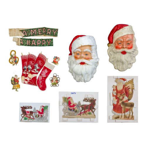 Including (2) papier mache Santa head wall plaques, stockings, paper die-cut ornaments, a sash, embossed and die-cut decorations