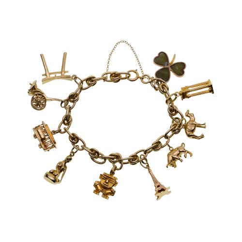 Chain charm bracelet having ten charms (bracelet and some charms marked "14k")