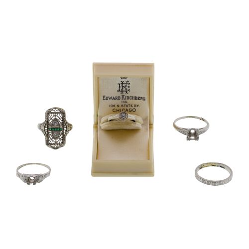(5) items including a setting having six round cut side diamonds and a band having seven round cut diamonds (unmarked platinum) as well as an Art Deco style ring having princess cut emeralds and round cut diamonds, a setting having four round cut side diamonds and a baby ring having a round cut diamond in a book-shaped storage book (18k rings marked "18k")