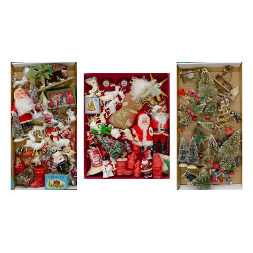 Approximately (60) items including trees, Santa figures, plastic deer and plastic buildings