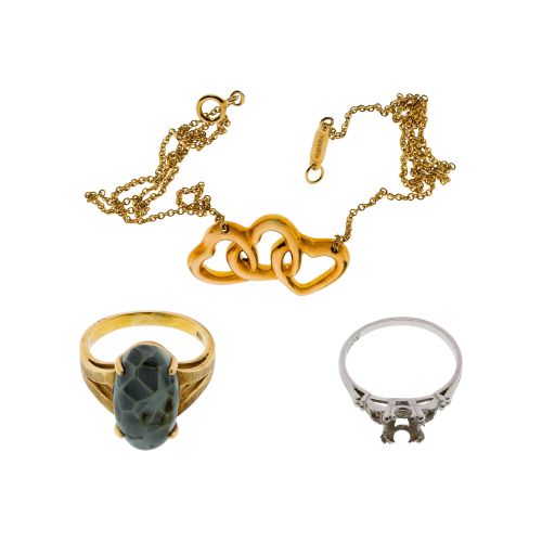 (3) total items including a Tiffany & Co. attached three-heart pendant on necklace and a ring having an oval cut veined green gemstone (marked "18k" / "750"); together with a platinum ring setting (marked "950 plat")
