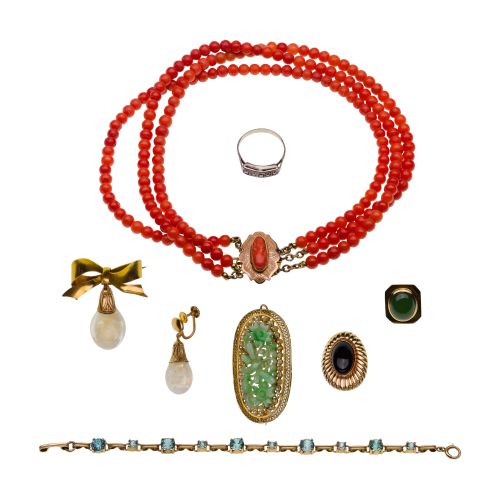 (8) items including a coral bead necklace having a gold clasp with a carved coral insert, a brooch having a carved jadeite jade insert surrounded by seed pearls, a bracelet having ten alternating size round cut blue topaz, a ribbon brooch having a glass drop, a lapel pin having an oval cut cabochon jadeite jade, (2) single earrings and a white gold ring having five round cut diamonds (most marked "14k")
