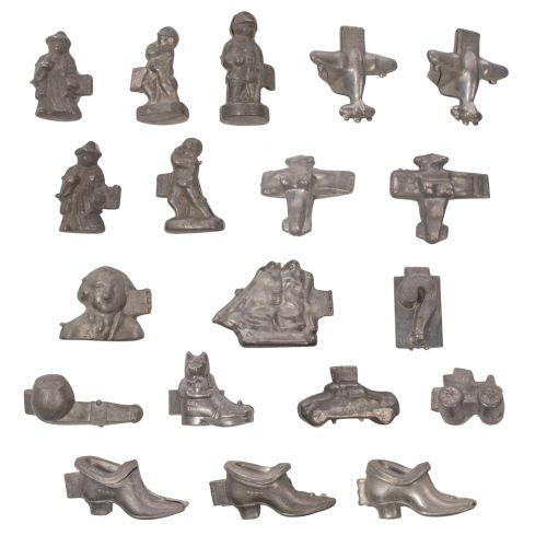 (19) items including George Washington, airplanes, figures, cars, shoes, ship, question mark, shoe with dog and smoking pipe, some marked "E&Co." for Eppelsheimer & Co