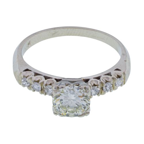 Having a round center diamond weighing approximately 0.89 carat (6.24 x 3.8mm), H/I color, SI clarity, no florescence noted, flanked by (6) round diamonds approximately 0.05 carat each, two having noted florescence (marked "14k")