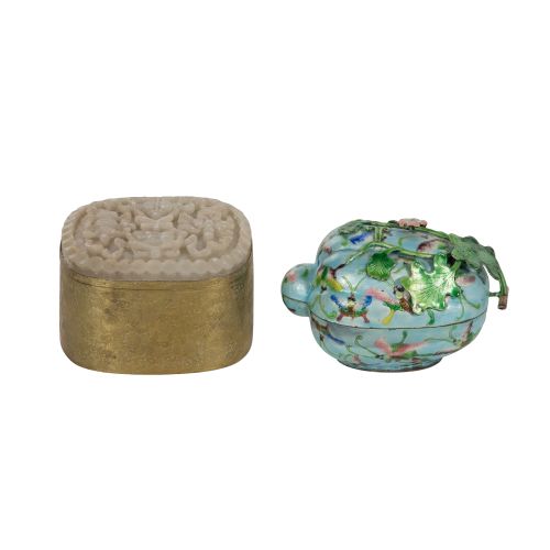 (2) total items including an embossed metal box having a carved jadeite jade lid; together with an enameled copper melon form box having a butterfly and three-dimensional vine and leaves, illegible impressed marks on bottom