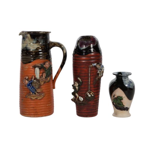 (3) c.1900 items including a pitcher and (2) vases, having applied three-dimensional figures, pitcher and vase having blue underglaze applied plaque bearing marks of Inoue Ryosai