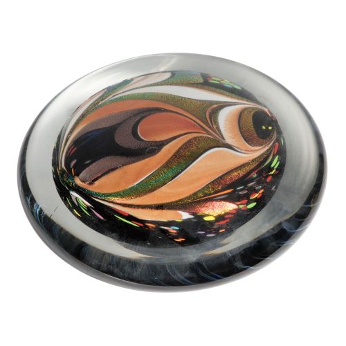 Undated, unsigned, blown glass having multi-color dichroic and cane elements cased in clear glass, ground and polished underside having opening at center