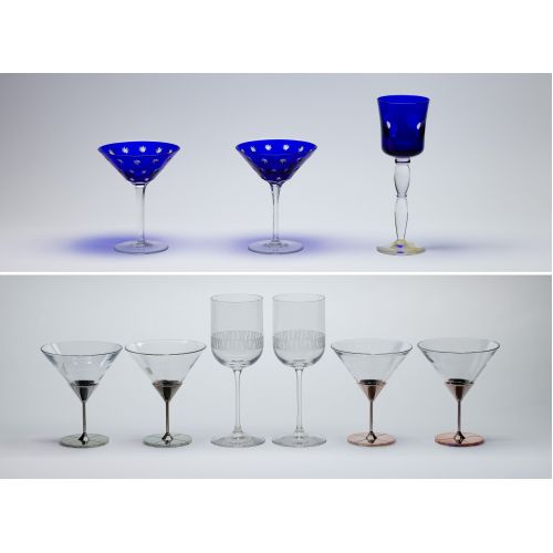 (9) items including a pair of Faberge Galaxie martini glasses in original fabric covered and lined case, (2) pairs of Vera Wang Challis martini glasses, both pairs having original boxes, a Vera Wang Modern Graphic goblet in original box, another unboxed and a cobalt cut-to-clear goblet having Saint-Louis label, unboxed