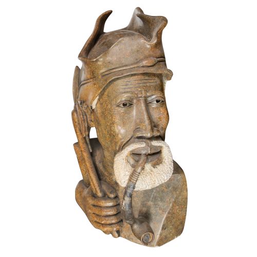 Undated, signed, hand carved bust depicting a man with a pipe