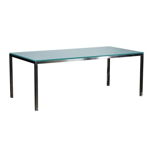 Glass top having a frosted underside, supported on brushed stainless steel square tube frame and legs