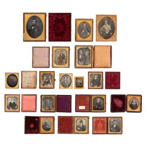 (17) items, all portraits, including (2) half-plate in a leather case having split hinge and an uncased, (3) quarter-plate of which (2) are in leather cases having split hinges, the third in a case without cover, (11) sixth-plate comprising (6) in intact leather cases, (2) in leather cases having split hinges, (2) in cases without covers, a loose without case and a ninth-plate without case