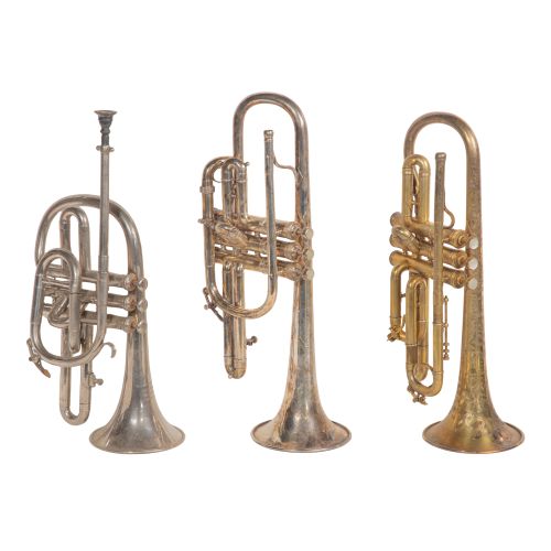 (3) items including a Pelisson Freres pocket trumpet and an H. N. White King coronet, both silver plated, as well as a Frank Holton engraved brass coronet having hard case