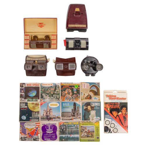 Approximately (25) items of various shapes, sizes, models and colors, most being "Sawyers View-master", some electric; together with approximately (700) reels in nature, religious, cities, entertainment and comics