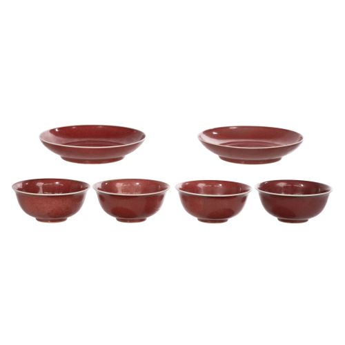 (6) items, all having oxblood red glaze overall except rims and feet, including (4) matching having underglaze blue 6-character Guangxu marks underside and (2) matching low bowls having underglaze blue archaic script Guangxu seal marks underside