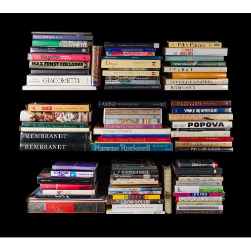 Approximately (80) hard and soft cover books, in various shapes and sizes including artists such as Degas, Andy Warhol, Homer, Cezanne, Rockwell, Magritte and Rembrandt, some having dust covers, some having slip cases
