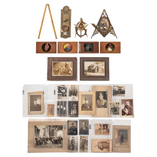 Approximately (30) total items including mounted portraits of uniformed police officers and firefighters, a mounted group shot of the Knights Templar band of Kansas City, Missouri, photographic postcards showing detained criminals and aftermath of Dillinger raid on Manitowoc, Wisconsin, other photographic images including a paddy wagon and a fire engine, a tintype noted; together with a magic lantern slide having slip mechanism depicting an organ grinder and monkey, (2) Masonic and a Knights of Malta magic lantern slides, brass Masonic motif doorknob and backplate, (2) brass Masonic frames (one having portrait) and a folding 12-inch ruler