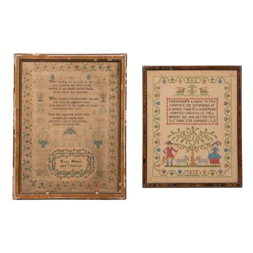 (2) items including an undated by "Emily Henley / Aged 9 Years" having a devotional poem within a floral border in a wood frame (lacking glass) and a cross-stitch having devotional poem above a tree flanked by a shepherd and a shepherdess, initialed "R.M.K." at top and dated "1928" at bottom of floral border, behind glass in a wood frame retaining a Marshall Field's label verso