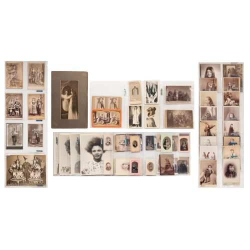 Approximately (80) items including cabinet cards, cartes de visite, card-mounted photograph, stereoviews, a tintype noted and an 8 x 10-inch gelatin silver prints depicting elaborate or lengthy hairstyles as well as elaborate costume, many in a binder labeled "Costume"