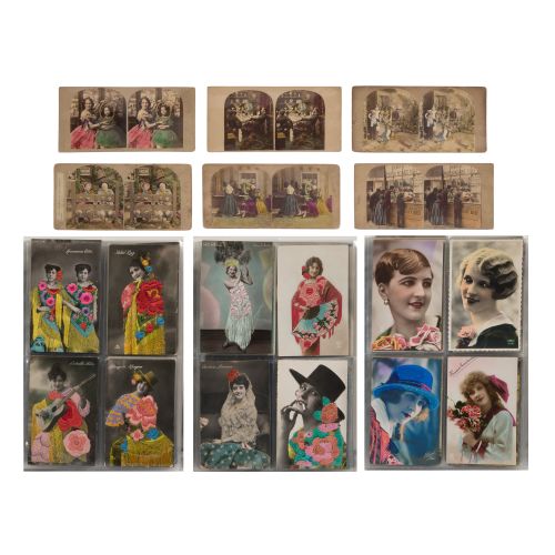 Approximately (125) items of various shapes, sizes, materials and subjects including postcards, cabinet cards, stereoviews and photographs, some hand colored, embossed, embroidered, some loose, most in a labeled binder