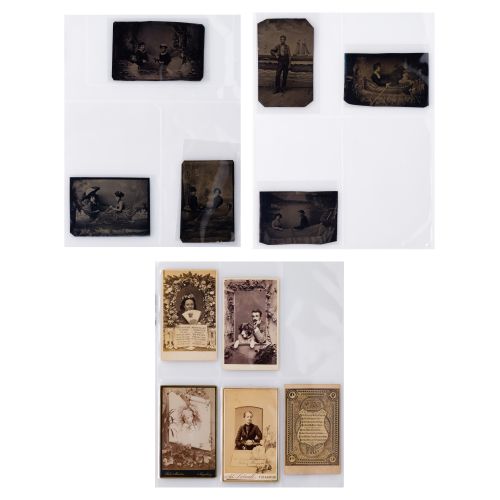 Approximately (75) postcards, cartes de visite, glass plates, photographs and cabinet cards of various scenes, props, sizes and subjects including snow, flowers, boats, in a labeled binder
