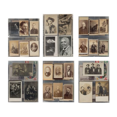 Approximately (210) total items in three binders, including cabinet cards, cartes de visite, tintypes, photographic postcards and gelatin silver prints, one binder having depictions of noted 19th and early 20th century statesmen, scientists and cultural figures including Alexander Von Humboldt, Charles Darwin, Einstein, Gustave Eiffel, Chester A. Arthur, Buffalo Bill and Will Rogers, another binder having images of smokers, the third binder having portraits; together with approximately (20) printed graphic portraits of pre-photography subjects including Founding Fathers