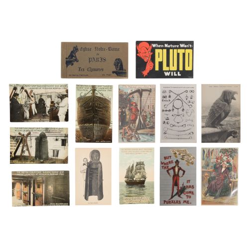 Approximately (60) items including a series of postcards depicting Chinese Republic era public executions in 1928 Tianjin China, other execution views, implements of torture, a series depicting British convict ships, grotesque architectural sculpture including gargoyles and a bound booklet of French architectural views; together with approximately (10) printed graphic depictions of Medieval torture and diabolic imagery