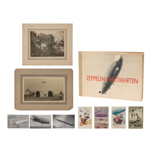 Approximately (90) total items including mounted and unmounted photographs, stereoviews and postcards depicting zeppelins and other airships as well as a first edition copy of "Zeppelin Weltfahrten" from 1932 containing 264 individual 1.5 x 2.25-inch silver bromide prints depicting development and operations; together with (16) printed graphic arts topical postcards