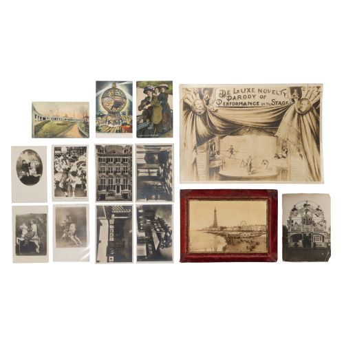 Approximately (200) items including cabinet cards, stereoviews, mounted souvenir images, postcards, press and other photographs, many in a binder marked "Carnival" depicting floats and regalia from around the world, views of the Columbian Exhibition and other fairs, Ferris wheels and other rides and a framed albumen print of the tower and Ferris wheel at Blackpool, England