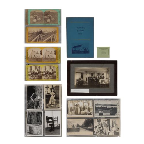 Approximately (125) total items including cabinet cards, cartes de visite, stereoviews and postcards depicting members of the Shaker movement and activities, many in a binder, a framed mounted to card behind glass in a wood frame; together with approximately (30) ephemeral items including paper labels for herbs and ointments, booklets and a map
