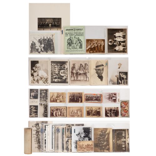 Approximately (75) items of various sizes and subjects, including postcards, cartes de visite, and photographs, featuring jazz, female and big bands, most loose and in plastic sleeves