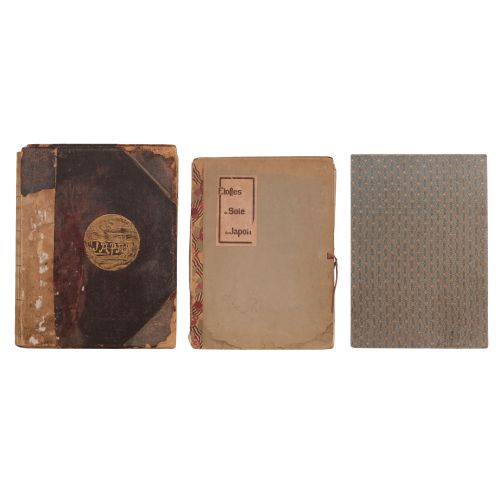 (3) items including "Etoffes de Sole du Japon" portfolio of illustrations of silks from Japan, an 1898 "Japan: Section VIII" detailed views on daily life, customs, agriculture and art, having photographs and illustrations in a specially made linen covered box and an accordion style Shunga book having illustrations hand painted on silk