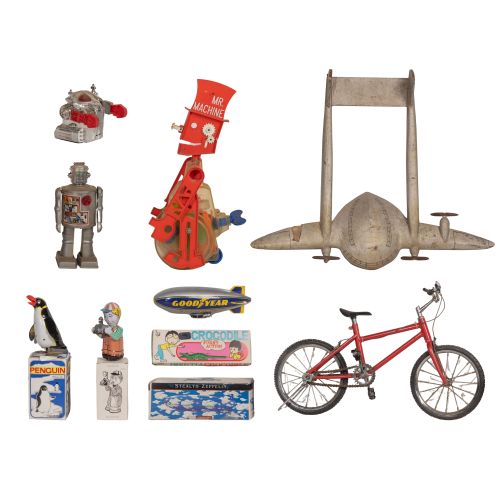 (18) items of various shapes, sizes and genres including blimps, spaceships, robots, a bicycle, some wind-up, some in original boxes