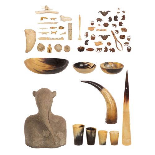 Approximately (35) total items of various forms, sizes and materials including bone, wood, horns and nut shells; together with a papier mache bust